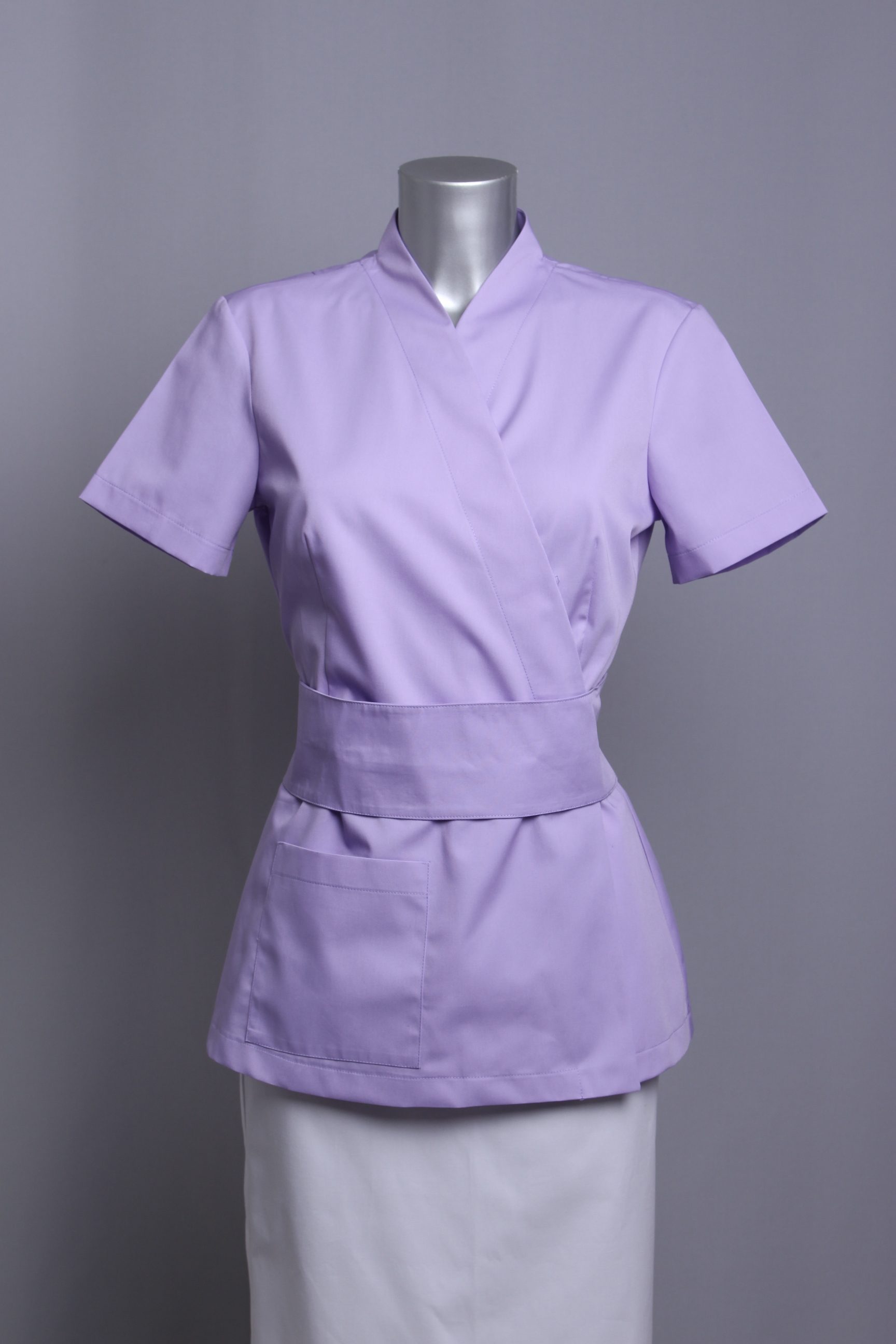 Clasping with two hidden druckers, a belt fixed to the front ties with two narrow straps on the back, one pocket, short sleeves. Wear-friendly, easy to maintain, up to 2% shrinkage.