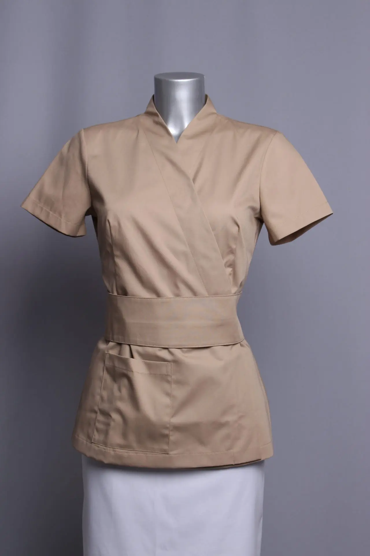 Kragna podignuta uz vrat, kosi preklop koji se kopča sa dva skrivena drukera, pojas fiksiran na prednjicu veže se trakama na leđima, jedan džep, kratki rukavi. Materijal ugodan za nošenje, lako održavanje, skupljanje do 2 % u širunu i duljinu.