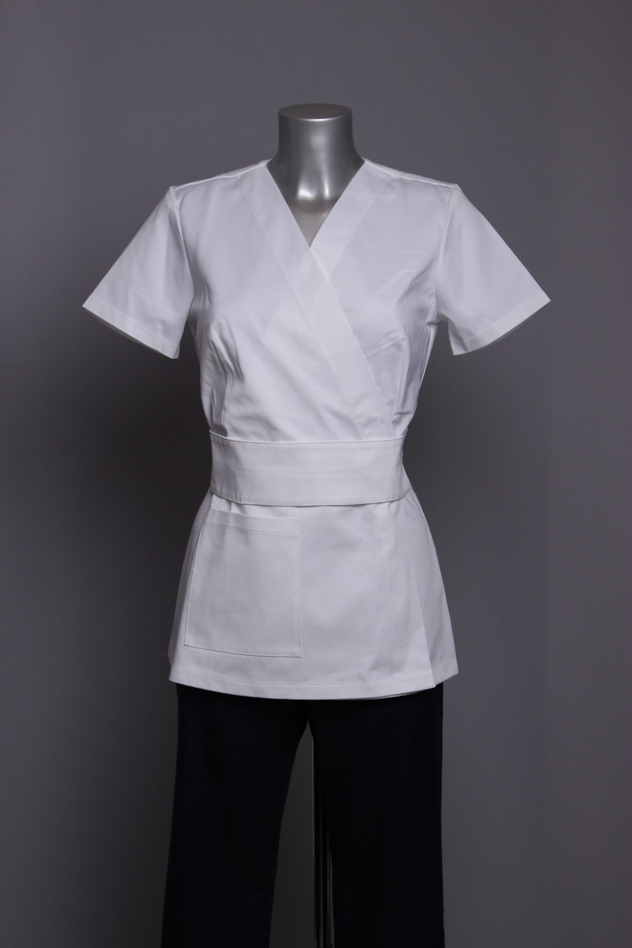 Bluza se zatvara preklopom skrivenim kopčanjem sa dva drukera, pojas fiksiran na prednjicu veže se na leđima, jedan džep, kratki rukavi.